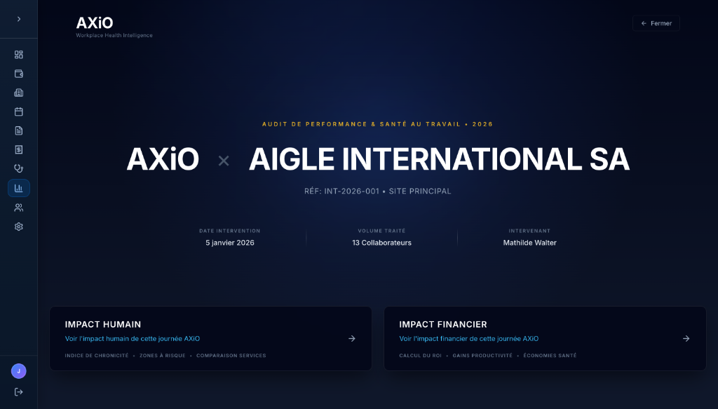 Chaque journée AXiO génère un rapport interactif : baisse des TMS mesurée, ROI calculé, santé de vos équipes suivies. Enfin de la vraie data QVT.